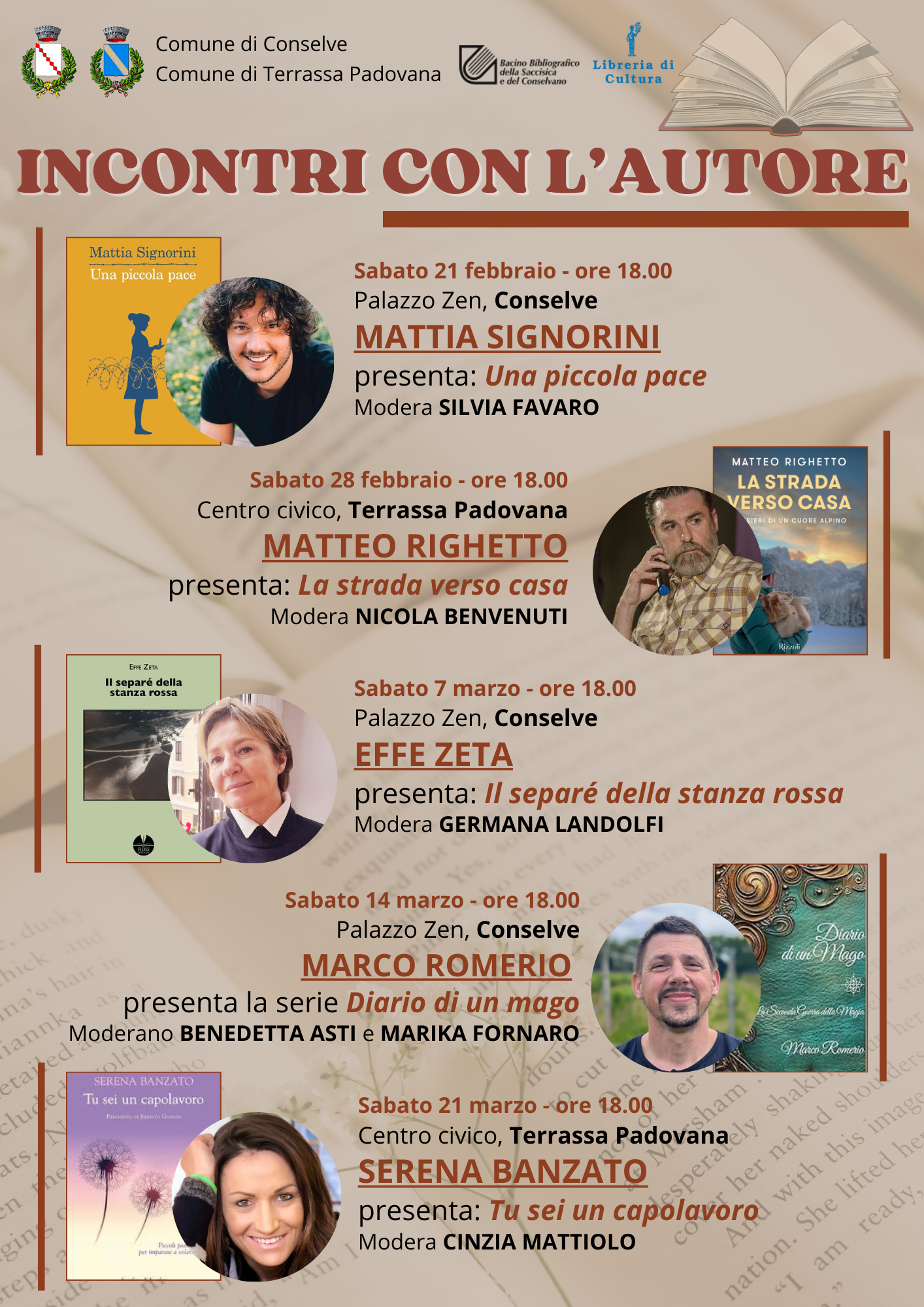 – sabato 21 febbraio (ore 18 presso Palazzo Zen a Conselve), Mattia Signorini presenterà Una piccola pace; a moderare l’incontro sarà Silvia Favaro.